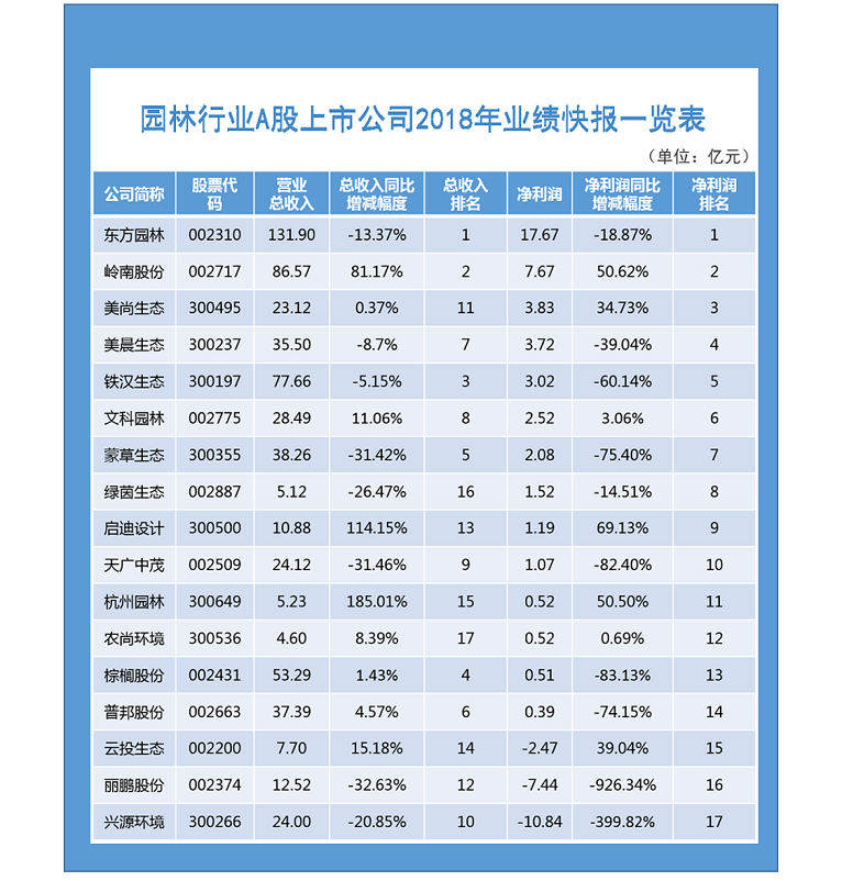 近期,A股园林行业的大部分上市公司相继宣布了2018年度业绩快报。我们对已宣布快报的公司举行了业绩数据整理,以资助各人更周全地相识已往一年的行业生长情形。